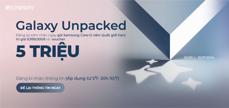 Để chào đón sự kiện Galaxy Unpacked 2024, Oneway hân hoan đem đến chương trình ĐĂNG KÝ NHẬN THÔNG TIN GALAXY UNPACKED: MẶC ĐỊNH GIẢM 1.5 TRIỆU, BỐC THĂM VOUCHER GIẢM THÊM 5 TRIỆU VÀ NHIỀU PHẦN QUÀ - TỔNG GIÁ TRỊ LÊN TỚI 30 TRIỆU.