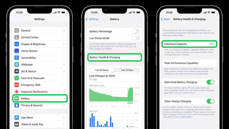 - Kiểm tra tình trạng pin thường xuyên: Nếu sử dụng các thiết bị iOS, người dùng có thể theo dõi tình trạng pin của máy trong phần cài đặt. Khi thấy tình trạng pin quá thấp (dưới 80%) thì nên tìm một cơ sở uy tín và thay thế pin mới.