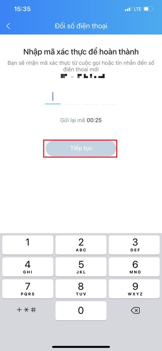 Bước 5: Sẽ có tin nhắn hoặc cuộc gọi đến số điện thoại mới để gửi mã OTP, nhập mã OTP đưuọc cấp và chọn Tiếp tục