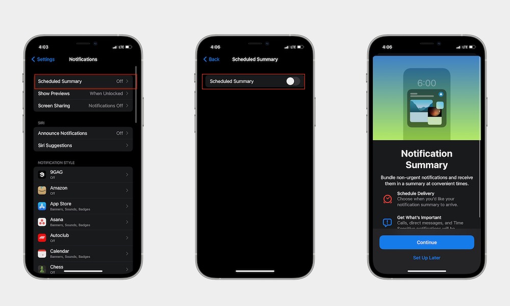 Bước 2: Nhấn Tóm tắt lịch trình (Scheduled Summary) --> Bật Tóm tắt lịch trình --> Tiếp tục (Continue)