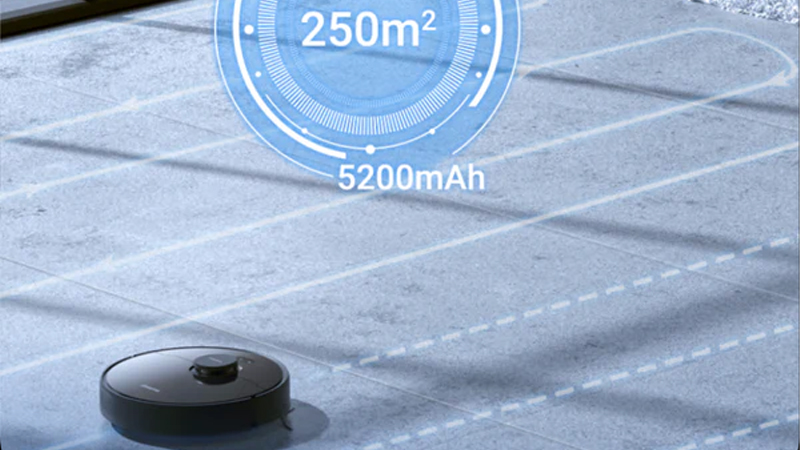 Dreame D9 Max sở hữu dung lượng pin khủng lên đến 5200 mAh. Với dung lượng pin này, D9 MAX có thể hoạt động liên tục lên đến 150 phút, tùy vào cài đặt lực hút của người dùng, cho phép dọn sạch diện tích lên đến 250m2 chỉ với một lần sạc. Khi gần hết pin, D9 MAX sẽ tự động quay về trạm sạc để sạc đầy pin. Thời gian sạc đầy pin chỉ khoảng 2 giờ, người dùng có thể yên tâm để robot tự động dọn dẹp nhà cửa mà không cần lo lắng về việc hết pin.