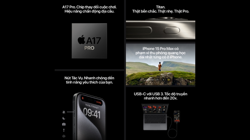 Từ bảng so sánh, iPhone 15 Pro Max có 5 điểm khác biệt nổi bật so với phiên bản tiền nhiệm. Khung Titanium bền bỉ chống va đập và tối ưu trọng lượng tốt hơn các phiên bản khung nhôm. Thêm nữa, viền màn hình máy thu nhỏ mang đến diện mạo hoàn toàn mới, sang trọng và cuốn hút. Cổng sạc USB-C 3 thay thế cổng Lightning hỗ trợ tốc độ truyền tải lên đến 10Gbps. Người dùng có thể dễ dàng mượn sạc sử dụng trong trường hợp quên mang theo. Về phần cứng, con chip A17 Pro cho thấy hiệu năng vượt trội 10% nhân CPU và 20% nhân GPU so với A16 Bionic. Ngoài ra, vi xử lý mới còn hỗ trợ ray tracing nhanh gấp 4 lần mang đến trải nghiệm đồ họa gaming mượt mà. Đều đặn mỗi năm, Apple sẽ ra mắt một phiên bản màu sắc mới, năm nay cũng không phải ngoại lệ với sự xuất hiện của màu Titan tự nhiên. Gam màu độc đáo hứa hẹn sẽ được nhiều người dùng đón nhận.
