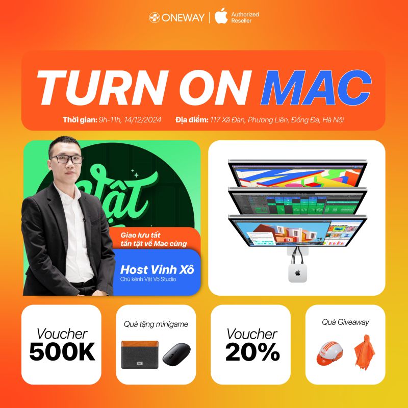 Cơ hội dành riêng cho các tín đồ đam mê công nghệ, yêu thích sáng tạo và muốn khám phá sức mạnh từ những dòng sản phẩm mới nhất của Apple - tham gia ngay Workshop "TURN ON MAC" - TRAO QUÀ CUỐI NĂM để được trải nghiệm thực tế dòng máy Mac mới nhất như Mac mini M4, MacBook Pro M4, MacBook Air M3, Apple Studio Display qua các hoạt động như hậu kỳ ảnh, render/edit video hay sử dụng ứng dụng chuyên sâu. Cùng giao lưu tất tần tật về Mac cùng Host Vinh Xô. Cùng với đó, chơi mini game và săn ưu đãi hấp dẫn cùng rất nhiều quà tặng khủng. Đăng ký tham gia ngay để không bỏ lỡ hành trình nâng tầm trải nghiệm công nghệ cùng Oneway!
