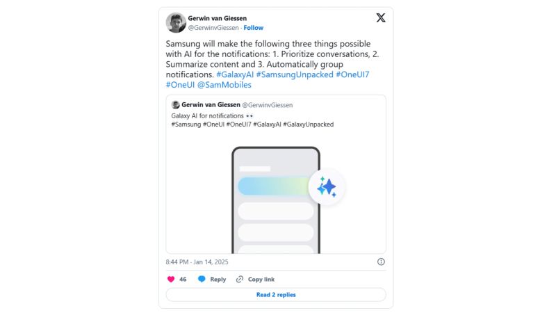 Theo tài khoản @GerwinvGiessen trên mạng xã hội X, Galaxy S25 Series sẽ được trang bị ba tính năng AI giúp xử lý thông báo thông minh, bao gồm: