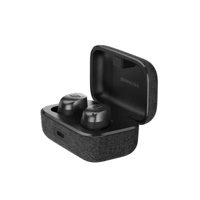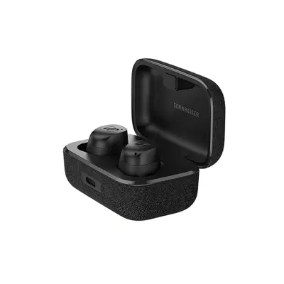 Hộp sạc của Sennheiser Momentum True Wireless 3 được bọc một lớp vải dệt vô cùng cuốn hút. Kích thước nhỏ hơn một chút so với phiên bản tiền nhiệm, giúp người dùng dễ dàng cầm nắm và bỏ túi. Phía trước hộp sạc được tích hợp cổng USB Type-C và đèn báo tình trạng pin. Phiên bản năm nay được mang đến 3 màu sắc cực trẻ trung và tinh tế gồm đen, trắng và xám graphite.