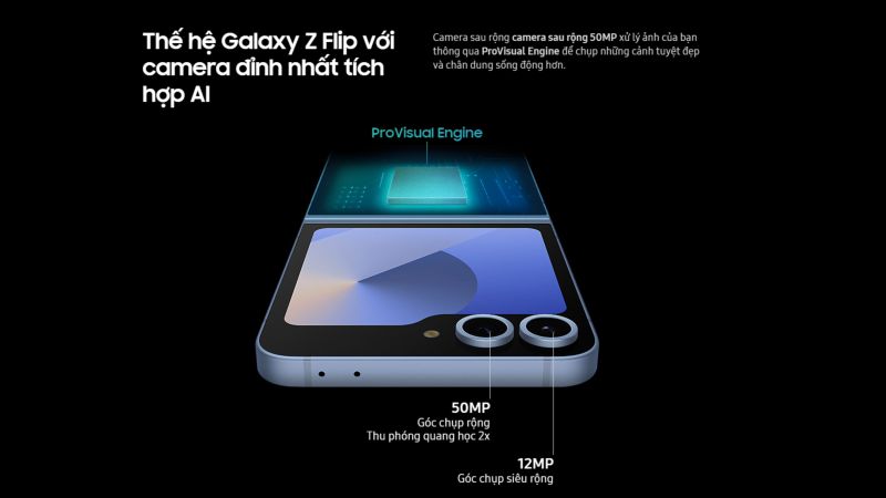 Camera trên Galaxy Z Flip6 cũng được nâng cấp mạnh mẽ, với camera chính được nâng cấp lên 50MP thay vì 12MP như trước đây, khẩu độ f/1.8, đi cùng với đó là camera góc siêu rộng 12 MP. Đặc biệt, camera chính của máy được tích hợp công nghệ ProVisual Engine để có thể chụp cảnh và chân dung sống động hơn. Ở mặt trước, máy được trang bị camera selfie 10MP khẩu độ f/2.2.