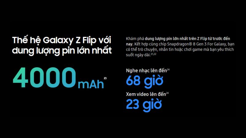 Galaxy Z Flip6 cũng được hứa hẹn sẽ có thời gian sử dụng lâu hơn với viên pin được 4.000mAh, hỗ trợ sạc nhanh 25W. Theo công bố của hãng, với viên pin lớn hơn sẽ giúp Galaxy Z Flip6 có thể sử dụng mạng LTE lâu hơn 2 tiếng và nhiều hơn 3 tiếng khi xem video. Ngoài ra, máy cũng hỗ trợ các chuẩn kết nối khác như: 5G, Wi-Fi 6, Bluetooth 5.3 giúp máy có khả năng kết nối dễ dàng và mạnh mẽ.